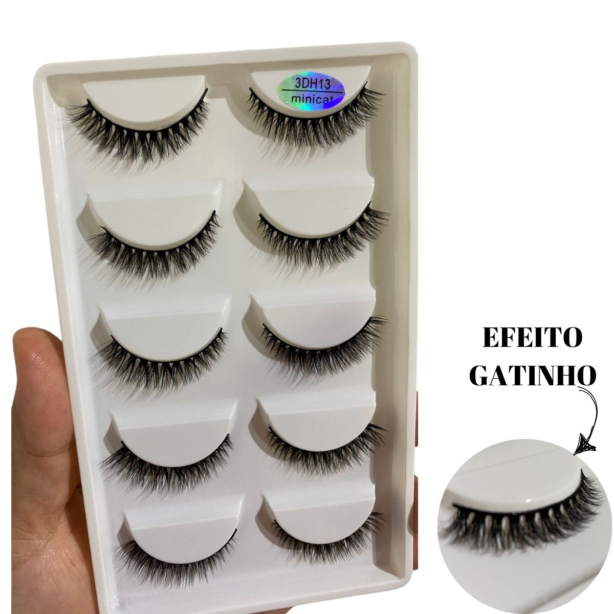 CAIXA COM 5 PARES DE CÍLIOS POSTIÇOS 3D H13 MINICAT MODELO GATINHO COM TAMANHO MINI