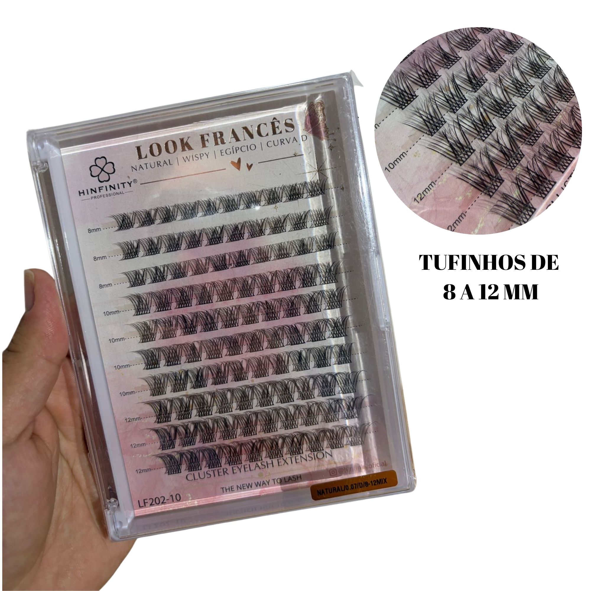 Cílios tufinho Look Francês Hinfinity desenvolvidos para criar efeito natural e elegante com aplicação personalizada. Os tufinhos permitem montar o volume desejado de acordo com o estilo da maquiagem, sendo muito utilizados para efeito semelhante à extensão de cílios ou para complementar cílios postiços tradicionais.